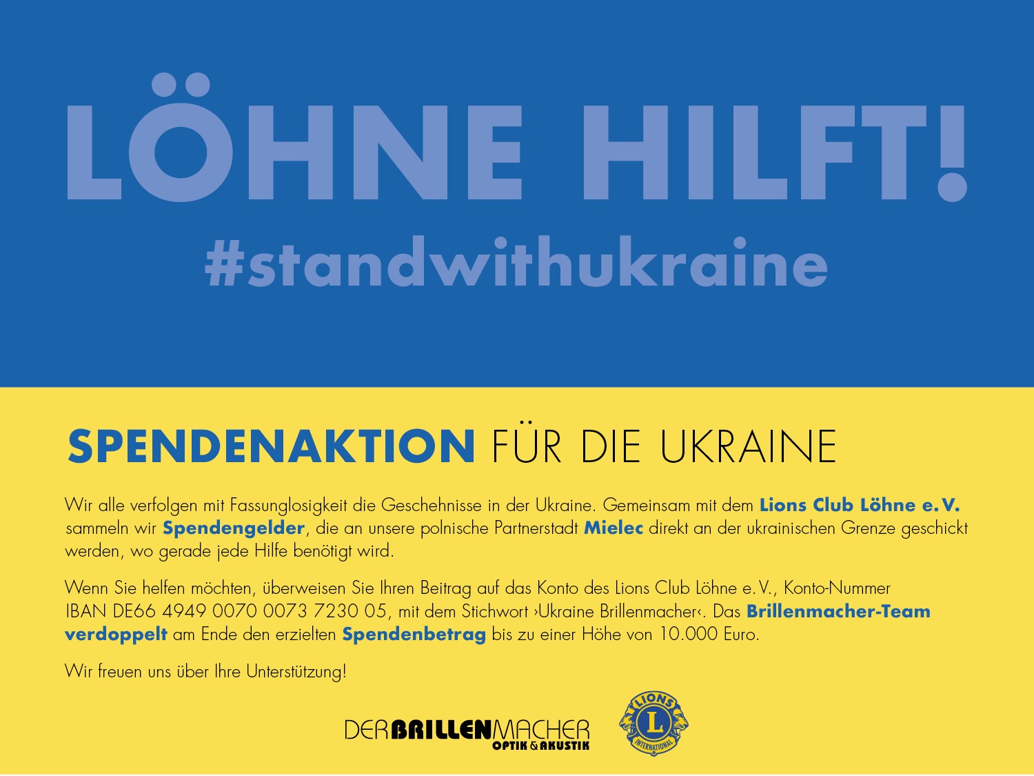 Wir alle verfolgen mit Fassungslosigkeit die Geschehnisse in der Ukraine. Gemeinsam mit Einzelhändlern aus Löhne sammeln wir Spendengelder, die an unsere polnische Partnerstadt Mielec direkt an der ukrainischen Grenze geschickt werden, wo gerade jede Hilfe benötigt wird. Wenn Sie helfen möchten, überweisen Sie Ihren Beitrag auf folgendes Konto: